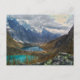 A postcard with a beautiful nature photograph. Featuring snow capped alpine mountains and tranquil ponds nestled inside the valley of these majestic mountains.