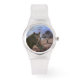 The original horse portrait on this unique, customizable wrist watch, is an original painting of a beautiful chestnut mare, The chestnut horse is a great symbol for all things to do with the horses, this watch will look good on any wrist, male or female and will make a unique gift for people working with animals, whether it be a horse vet or all animal veterinary treatment, blacksmith farrier, training or working with horse rescue. The horse portrait is set against an original stylized watercolor landscape image. This is a customizable watch, you can personalize it with your own text.