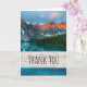 Thank you card with a beautiful photograph featuring a beautiful mountain range, grey and rust colours. A green lush forest surrounds a calm clear lake. Tranquil and peaceful image.