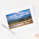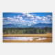Landscape photograph of an Alpine lake with distant snowcapped mountains behind the treeline.