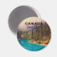 A magnet with a scenic Canadian landscape photograph. A turquoise coloured lake with a forest of pine trees in the background and a foggy misty sky giving it a magical mystical quality.