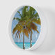 A clock with a beautiful and tranquil photograph of 2 palm trees under a bright blue sky.