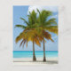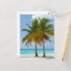 A postcard with a beautiful and tranquil photograph of 2 palm trees under a bright blue sky.