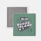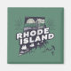 Stylish fridge magnet features a retro style scenic Rhode Island vignette in a state shaped silhouette. Green background