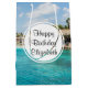 Birthday gift bag with a beautiful photo featuring a tropical beach resort.