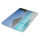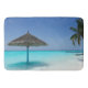 A bath mat with a photograph of a scenic tropical caribbean beach.. A white sandy beach and crystal blue waters with a solo thatched umbrella. Secluded and serene.