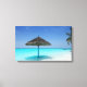 A canvas print with a photograph of a scenic tropical caribbean beach.. A white sandy beach and crystal blue waters with a solo thatched umbrella. Secluded and serene.
