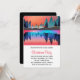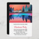 A Christmas party invitation with a beautiful graphic design featuring a peaceful lake with deer. and tall pine trees being reflected in the water. Stars hover overhead.