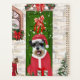 Schnauzer Dog Christmas sitting outside decorated home with Christmas wreath, Christmas tree is a perfect Christmas gift idea for dog lovers.
