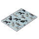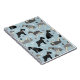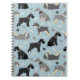Cute Schnauzer dogs in black, salt and pepper and black and silver coats sit, stand and rollover with scattered dog bones and paw prints on a light blue background.