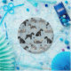 Cute Schnauzer dogs in black, salt and pepper and black and silver coats sit, stand and rollover with scattered dog bones and paw prints on a light blue background.