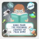 A school boy illustration, the kid reads a rook and wears blue glasses. A sticker bookplate for the child that goes to school