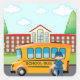 A school bus and its driver outside a school. This design looks really effective on these Stickers