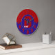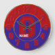 School Colours Round Wall Clock, Red & Blue Letter G-The background of this wall clock is a round circular frame, red on top, blue on the bottom trimmed with thin gold borders. In the centre is a cutout exposing a solid blue background. The clock numbers are red and blue collegiate numbers trimmed with digital stitching. In the centre is a large over-sized monogram letter also trimmed out in digital stitching. There is one text area in place already for you to personalize. Feel free to write a first name, last name; school name or anything else you would like to write on your clock. You may also delete that text area if you would rather not have it. Find coordinating School Colours gifts & products in my monogram store. www.zazzle.com/zazzlemonogram