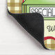 A mousepad for a school media specialist featuring an illustration of a computer mouse, a green book, and an apple. Design reads "Media Specialist" and is surrounded by a red frame. Tan gingham background. Personalize with your name under design
