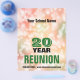 Fully customizable school reunion flyer with festive celebration party lights photo background and editable text. Change school name, year, and contact info, change or add any other text or images you like. Change text colour to your school colours if desired.