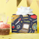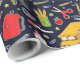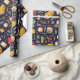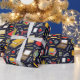 Creative teacher or student gift wrap or school party decoration featuring classroom supplies and school bus pattern.