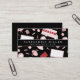 Modern business card features a stylish black and white school pattern with blush pink accounts. A fun and whimsical girly pattern of school buses, pens, pencils, chalkboards, apples and school supplies with custom name and title or role presented on a black banner with white text and accents. The back of the card is plain and simple with coordinating white text on a plain black background.