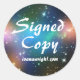 Create your own stickers "autographed copy" stickers that also promote your domain name for your author site. The space image is from NASA/Hubble program, and is a lovely rainbow coloured image of the Galaxy Cluster Abell 520. You may move the image around for different colours. The font size can easily be changed to fit any name.