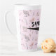 Tall latte mug for a hairdresser. Pale pink colour with background pattern of tools of the trade. Add a name over the black scissors image. The pattern consists of hair dryers, products, brushes and combs, and other items that a stylist would use.