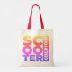 These bags were super cute (I purchased 3). The material is more of a canvas look & feel. The colour of the bag is slightly off white, but the letters look exactly as pictured. I took 3 photos in different lighting. Would recommend! I liked how there was an option to choose the font and colour of the name. The words are legible and the colours are exactly as pictured.