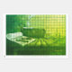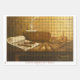 Still Life Serigraphy depicting cigars, score sheet, humidor, glass of liquor, cigar cutter and burning cigar in ash tray sitting on an old wooden table, contains the colours sienna, firebrick, old lace, maroon, blanched almond, saddlebrown, black. sandy brown, navy, bisque.