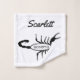 Ce superbe linge de toilette présente une image art numérique d'un scorpion noir avec de grandes griffes et une grande piqûre sur la queue courbée au-dessus du haut de son corps, avec le mot Scorpio en texte noir gras dans le corps de l'arachnid. Un design amusant pour les gens célébrant un anniversaire né entre le 24 octobre et le 21 novembre sous le signe étoilé de Scorpio. Il y a du texte personnalisé pour que vous puissiez inclure un nom.