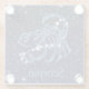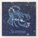 Glass coaster featuring the zodiac symbol for Scorpio in soft silver blue, overlaid with the stars of the constellation, against a starry sky background graded from deep midnight blue to black.