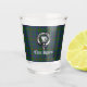 Stylish shot glass features Scottish Clan Agnew crest badge and customizable text on tartan background