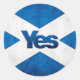 Round sticker with a textured Scottish flag and the word 'yes' - show your support for a Yes vote in the Scottish Independence Referendum!