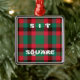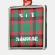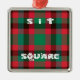 The image features a traditional tartan plaid pattern, a hallmark of Scottish textiles. Superimposed on this rich fabric are the words "SIT" and "SQUARE," arranged vertically. The word "SQUARE" incorporates small cartoonish figures embedded within the letters, adding a whimsical touch. The composition is balanced and focused, emphasizing both the tartan design and the text.