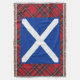 A cool throw blanket for lovers of Scotland and all things Scottish, with a graphic of the Scottish saltire flag with white St Andrew's Cross on dark blue. The background to the Scotland flag is a pattern of the famous Royal Stuart, or Stewart, tartan plaid.