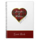 Chic Scottish plaid themed wedding guest notebook, done in white, with a big gold tone framed plaid heart and a red band, across the bottom. The bride and groom's names in white are inside the red, black, and yellow plaid heart, with additional custom text next to the heart and on the bottom red band. Personalize all the text to suit your wedding needs.