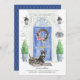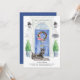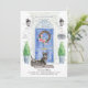Annoncez votre nouvelle adresse avec notre faire-part élégante avec un Terrier écossais, porte d'entrée bleue, tapis de bienvenue, ardoise, topiaires et une couronne fleurie posée sur un arrière - plan en brique grise.