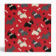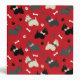 Cute black, grey and wheaten Scottie dogs wearing bows, with pawprints and dog bones on a red background.