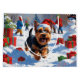 A cheerful Scottish Terrier runs happily through the snowy winter scene, wearing a festive red Christmas hat. This charming design highlights the breed’s distinctive silhouette, wiry coat, and spirited personality while capturing the warmth and joy of the holiday season. A delightful winter moment full of festive cheer.