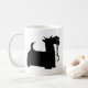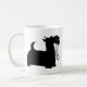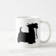 A black silhouette profile of a Scottie dog with it’s leash held in it’s mouth, tail up and eager to go for a walk.