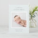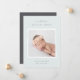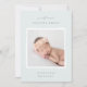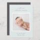 Une faire-part de naissance élégante aux couleurs douces présente une photo carré de nouveau-né encadrée en blanc, avec "bienvenue [Nom]" en haut en lettres gris chic. Personnalisez avec la date de naissance du bébé, et les statistiques de naissance en dessous, et ajoutez un message personnel à l'arrière, ainsi qu'une photo supplémentaire.