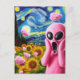 A screaming pink alien AI generated art that is a parody of some of histories fine artists combining elements of The Scream by Edvard Munch with some Van Gogh like sunflowers and Starry Night and maybe it's screaming because it is raining cottoncandy from the sky