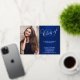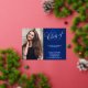 Elegant script font photo graduation party invitations to celebrate your big day. Classic school colours of gold, white and navy blue. A great choice for a high school senior graduation, college graduation or graduation party. THE SAMPLE PHOTO IS NOT INCLUDED. REPLACE WITH YOUR OWN PHOTO BEFORE ORDERING.