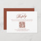 Faites vos invitations de mariage inoubliables avec cette carte RSVP de mariage élégante dans un design bordeaux minimaliste. Doté d'un script de calligraphie classique et d'une typographie traditionnelle, il capture l'élégance et la sophistication traditionnelles. Le modèle de code QR offre un moyen pratique pour les invités à RSVP, tandis que le texte de la réponse gentille ajoute une touche attentive. Cette carte de réponse élégante complète un design formel et élégant et s'aligne parfaitement avec votre gamme de papeterie correspondante pour un look cohésif et poli.