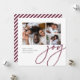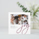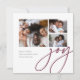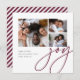 Partagez votre joie avec ces cartes de fin de année colorés et modernes avec 3 de vos photos préférées (un carré et deux petites horizontales ou orientées paysage). "Joy" apparaît dans un script décontracté et moderne écrit à la main dans une belle teinte de prune bordeaux à bijou. Personnalisez avec votre salutation de vacances personnalisée, nom de famille, et l'année le long de la base. Un choix d'yeux dans une forme carré arrondie unique pour vos voeux de Noël 2021.