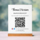 Panneau en acrylique blanc avec votre nom présenté dans un script de signature élégant et type d'entreprise en lettrage moderne simple. Entrez l'adresse de votre site Web pour créer un code QR numérisable pour les clients et les clients afin de voir vos produits, services, heures, etc. Ajoutez vos identifiants instagram et facebook pour que les clients puissent vous suivre sur les médias sociaux.