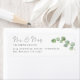 Script Eucalyptus M. Mrs Nom du retour Adresse. M. et Mme sont dans un script moderne de style manuscrit et votre nom et votre adresse sont ci-dessous et alignés à droite. Une branche de vert et un soupçon de feuilles d'eucalyptus dorés s'écoulent du côté droit.