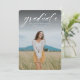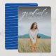 A simple classic script "graduate" in white accentuates a single vertical photo of your grad. This graduation announcement works for both college or high school graduates and is simple enough to let your photo shine. It's a timeless design and also features a striped backer with a customizable colour (default is blue). The words are at the top of the photo but the design is also available with the words at the bottom.
