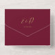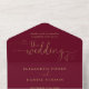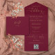 All in one burgundy and gold wedding invitation featuring elegant hearts script typography and monogram initials. The invitation includes a perforated RSVP card with your personalized wedding QR code. Designed by Thisisnotme©