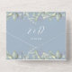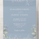 All-in-one greenery floral wedding invitation featuring elegant hearts script typography and monogram initials on a dusty blue background. The invitation includes a perforated RSVP card that features your wedding website QR code. Designed by Thisisnotme©
