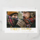 Gold effect stylish script happy holidays with coordinating mustard and black check tartan backer design. Space for a single photo design.