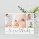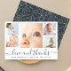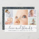 Un carte de remerciements de montage photo minimaliste de style moderne et carré est parfait pour remercier vos invités de baby shower pour les cadeaux, l'amour et le soutien reçus, et pour présenter votre nouveau-né au monde! Le design moderne comprend un collage de 5 photos personnalisables carrés. Ci-dessous il y a un message "amour et merci" dans un script élégant et le nom et les statistiques de votre bébé, en lettres simples. Le dos de la carte a un joli faux or délicat et un motif botanique bleu marine. Grâce au bouton "personnalisation", vous pouvez remplacer les photos et modifier le texte.