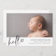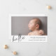 Faire-part de naissance avec script moderne bonjour avec un coeur mignon au lieu de la lettre "o". Une photo à l'avant et 3 à l'arrière.